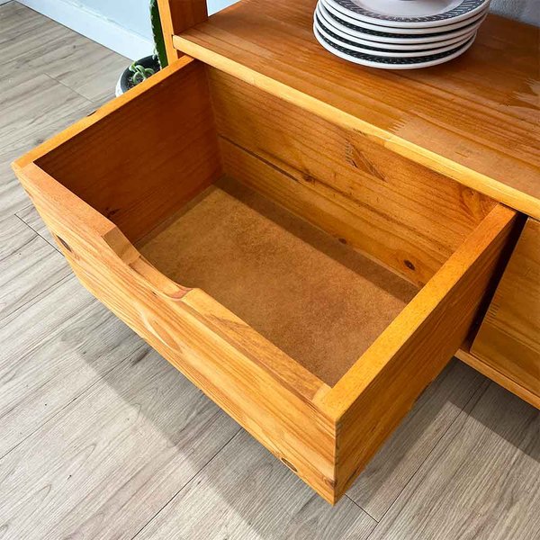 Aparador de Madeira Linea, a peça perfeita para transformar seu espaço com elegância e funcionalidade. Este aparador é ideal para quem busca um móvel versátil, que combina perfeitamente com diferentes estilos de decoração, desde o clássico ao contemporâneo. A madeira de pinus confere durabilidade e uma estética natural, ideal para quem busca um toque aconchegante em sua casa. Conta com 2 gavetas lindas feitas de madeira pinus e fundo em chapa de MDF de 4mm, resistente e com design rústico.