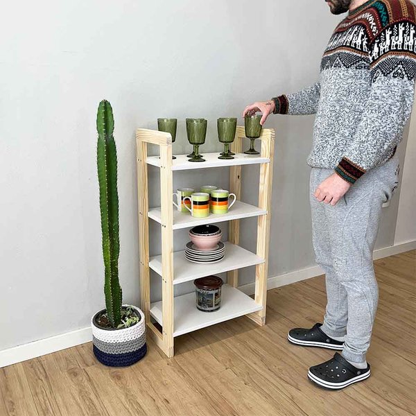 O Aparador Slim de Madeira Pinus é uma peça que alia organização e decoração em qualquer ambiente. Com 4 prateleiras resistentes, fabricadas em madeira de pinus de 1,8 cm de espessura nas prateleiras e 2,5cm nas laterais, e acabamento em selador, ela oferece charme e durabilidade. Sua cor Branco e Natural dá um toque rústico e moderno ao espaço. A pintura branca do móvel não é laqueada, então vai aparecer a textura da madeira pinus, isso traz um charme descolado à peça.