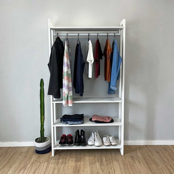 Organize suas roupas com estilo e praticidade usando a arara de roupas 100% em madeira pinus, perfeita para quem busca funcionalidade com um toque natural e elegante. Projetada com um cabideiro na parte superior, ela é ideal para pendurar roupas, enquanto as 3 prateleiras inferiores oferecem espaço para armazenar roupas dobradas, sapatos ou acessórios.