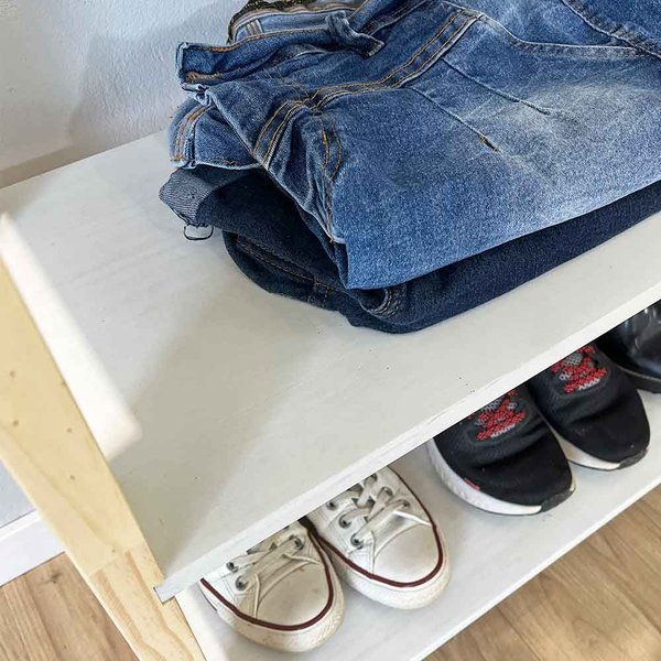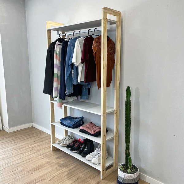 Organize suas roupas com estilo e praticidade usando a arara de roupas 100% em madeira pinus, perfeita para quem busca funcionalidade com um toque natural e elegante. Projetada com um cabideiro na parte superior, ela é ideal para pendurar roupas, enquanto as 3 prateleiras inferiores oferecem espaço para armazenar roupas dobradas, sapatos ou acessórios.