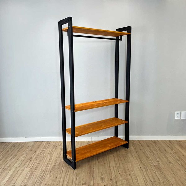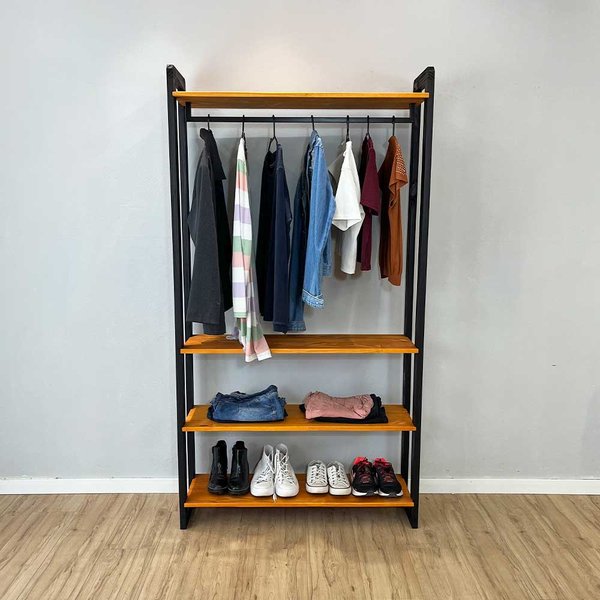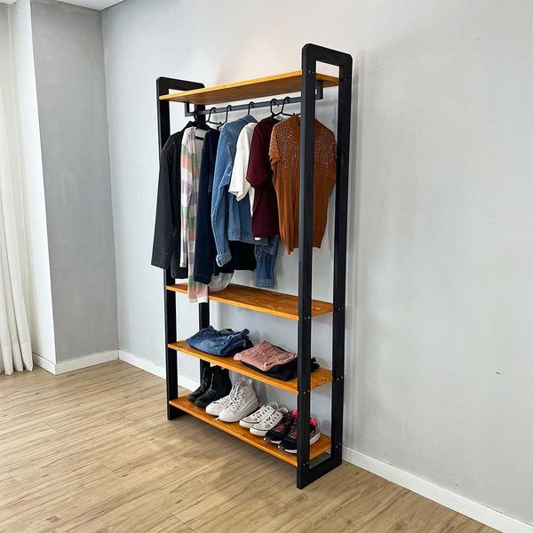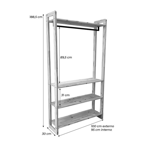 Organize suas roupas com estilo e praticidade usando a arara de roupas 100% em madeira pinus, perfeita para quem busca funcionalidade com um toque natural e elegante. Projetada com um cabideiro na parte superior, ela é ideal para pendurar roupas, enquanto as 3 prateleiras inferiores oferecem espaço para armazenar roupas dobradas, sapatos ou acessórios.