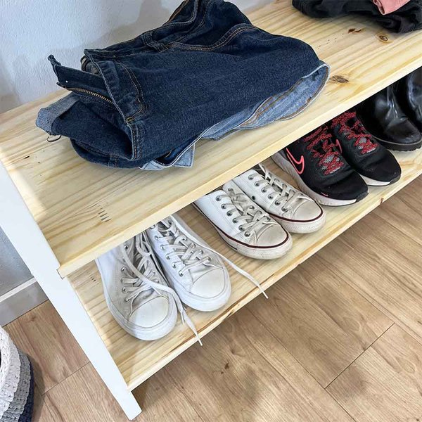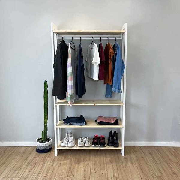 Organize suas roupas com estilo e praticidade usando a arara de roupas 100% em madeira pinus, perfeita para quem busca funcionalidade com um toque natural e elegante. Projetada com um cabideiro na parte superior, ela é ideal para pendurar roupas, enquanto as 3 prateleiras inferiores oferecem espaço para armazenar roupas dobradas, sapatos ou acessórios.