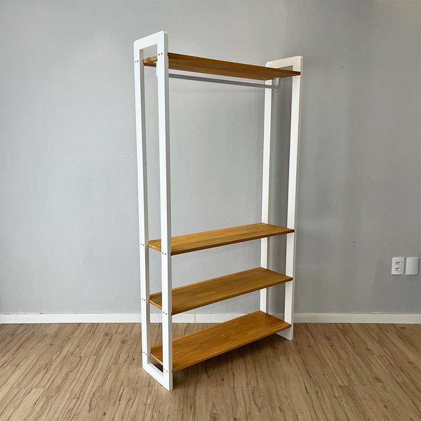 Organize suas roupas com estilo e praticidade usando a arara de roupas 100% em madeira pinus, perfeita para quem busca funcionalidade com um toque natural e elegante. Projetada com um cabideiro na parte superior, ela é ideal para pendurar roupas, enquanto as 3 prateleiras inferiores oferecem espaço para armazenar roupas dobradas, sapatos ou acessórios.