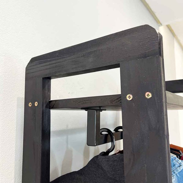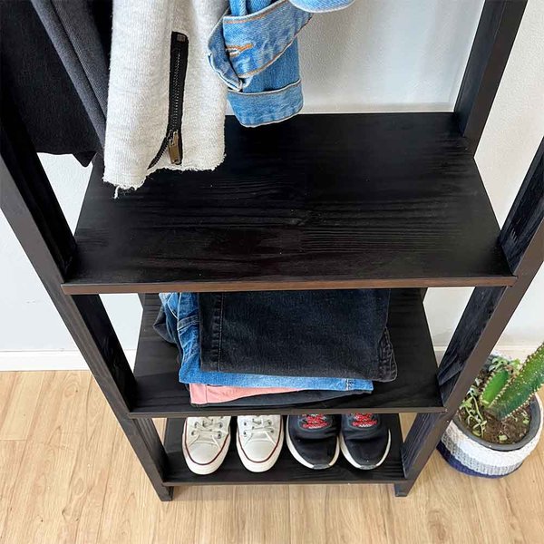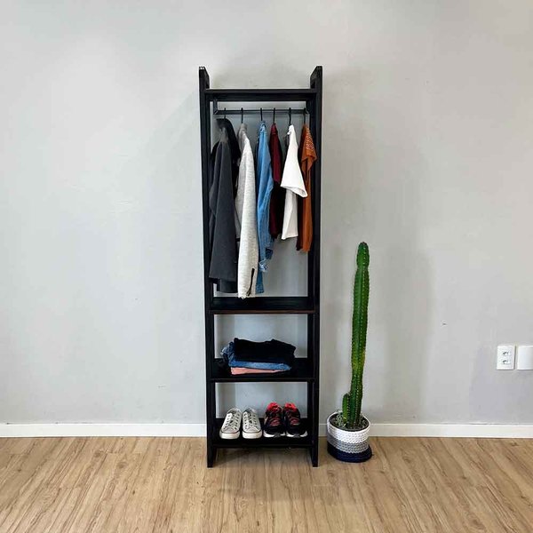 Organize suas roupas com estilo e praticidade usando a arara de roupas 100% em madeira pinus, perfeita para quem busca funcionalidade com um toque natural e elegante. Projetada com um cabideiro na parte superior, ela é ideal para pendurar roupas, enquanto as 3 prateleiras inferiores oferecem espaço para armazenar roupas dobradas, sapatos ou acessórios.