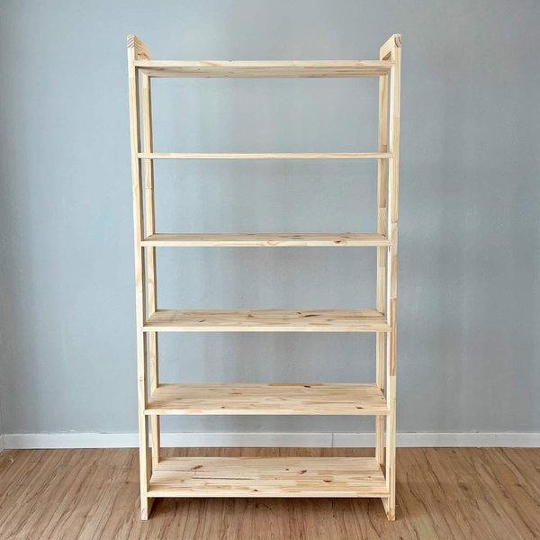 A Estante 6 Prateleiras de Madeira Pinus Linea Ample Natural é ideal para sala de estar, quarto, escritório ou home office, ajudando a organizar livros, objetos decorativos e acessórios do dia a dia.