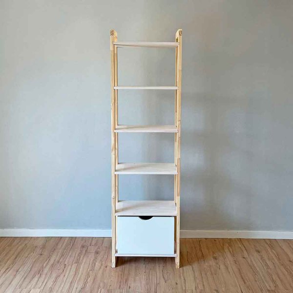 Com 6 prateleiras resistentes, fabricadas em madeira de pinus de 1,8 cm de espessura nas prateleiras e 2,5cm nas laterais, e acabamento em selador, ela oferece charme e durabilidade. Sua cor nozes dá um toque rústico e moderno ao espaço. Conta com 1 gaveta linda feita de madeira pinus e fundo em chapa de MDF de 4mm, resistente e com design rústico. A pintura branca do móvel não é laqueada, então vai aparecer a textura da madeira pinus, isso traz um charme descolado à peça.