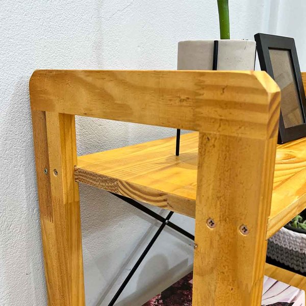 Suporta até 15kg. Por ser madeira maciça, a resistência é alta. Cada prateleira suporta com segurança livros e objetos decorativos. Recomendamos apenas que os itens mais pesados sejam colocados nas prateleiras inferiores para baixar o centro de gravidade do móvel.