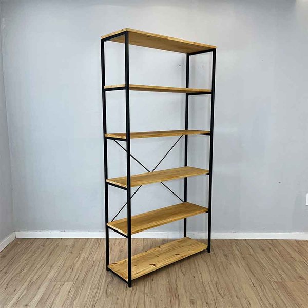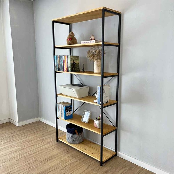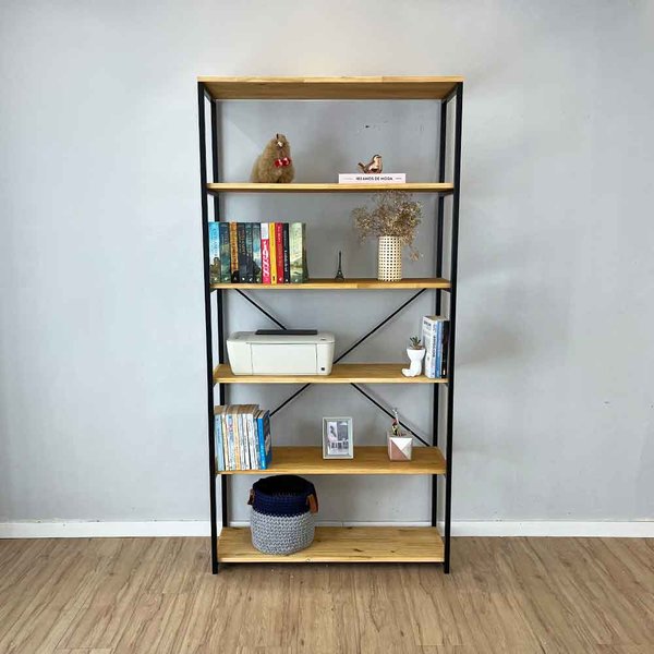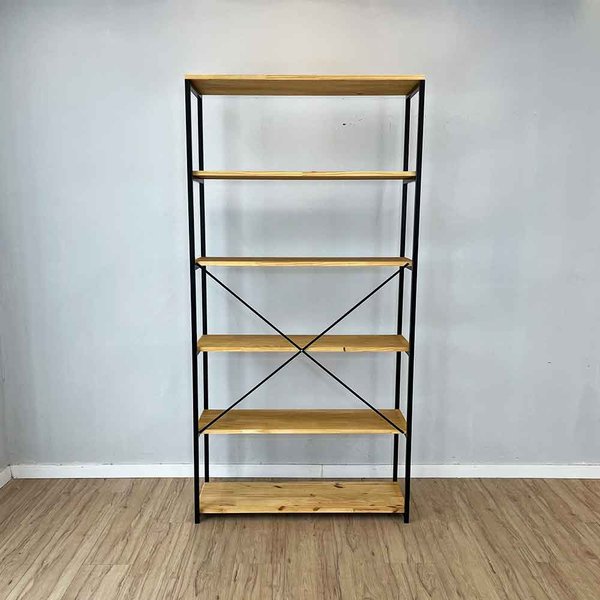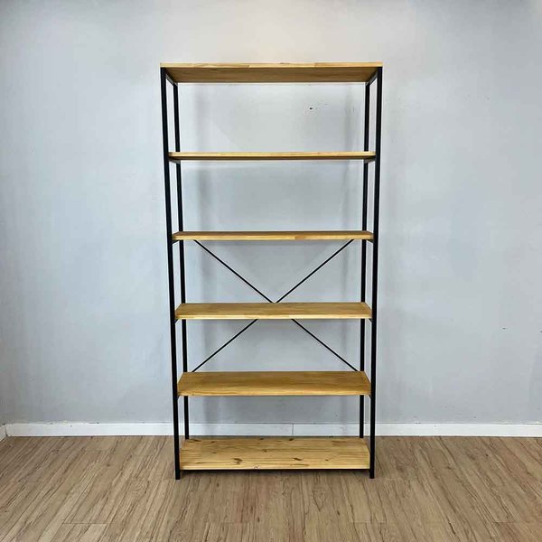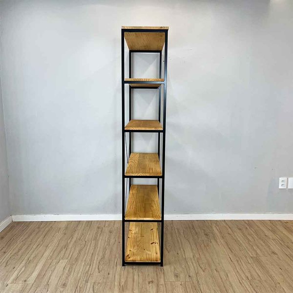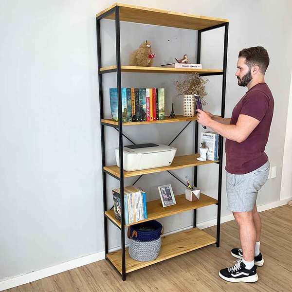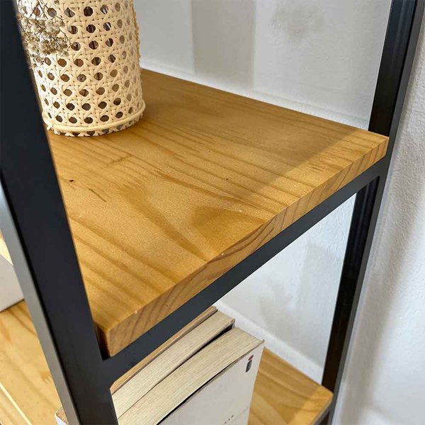 A estrutura é em ferro tubular com pintura eletrostática e as prateleiras são em madeira pinus maciça, finalizadas com selador que realça a textura natural.