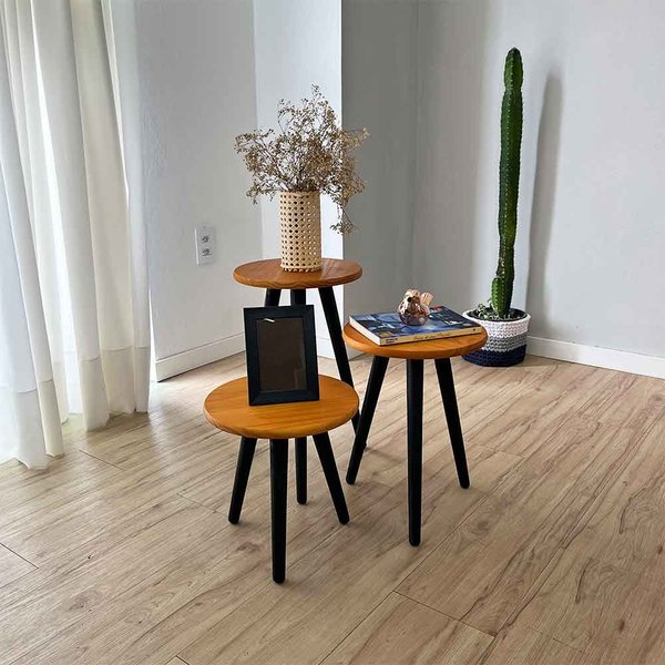 Use o trio para preencher e valorizar um canto "esquecido" da sua casa, como o espaço próximo a uma janela, ao lado de um aparador ou sob uma escada. Coloque as mesas juntas, uma ao lado da outra, e decore com itens que tragam vida, como vasos, estatuetas ou porta-retratos.